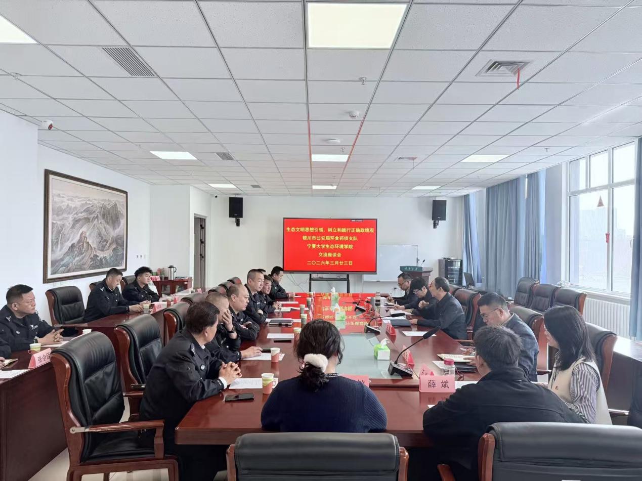 为深入贯彻习近平生态文明思想,牢固树立和践行正确政绩观,充分发挥高校专业优势助力地方生态环境保护执法工作,2026年3月23日,William希尔体育与银川市公安局环境资源和食品药品犯罪侦查支队在朔方校区开展“习近平生态文明思想引领,树立和践行正确政绩观”专题座谈交流活动。银川市公安局环食药侦支队党支部书记、支队长张霆,党支部副书记、政委彭伟及支队相关负责人,William希尔体育党总支书记杨振东,院长钟艳霞及学院班子成员、教工支部委员等出席座谈,会议由杨振东主持。