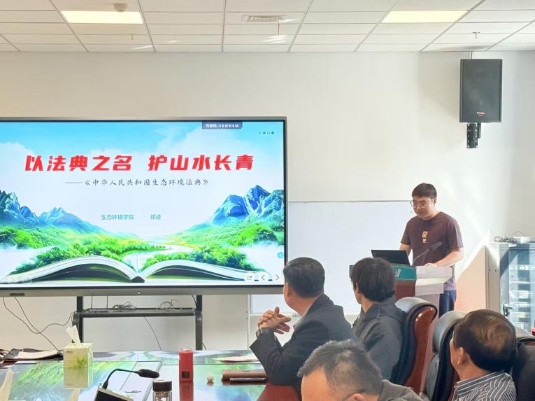 座谈会交流环节,五位师生代表结合各自工作与学习实际分享学习体会。杜灵通教授、生态系党支部书记马飞、环境科学与工程系党支部书记杨帆分别从专业课程体系改革、科研选题方向优化、特色学科建设布局等角度,交流了法典学习对教学科研工作的启发,提出要将《生态环境法典》相关内容融入本科核心课程、研究生专题教学及科研项目设计的具体方案,着力培养契合新时代生态环境法治建设需求的复合型专业人才。博士生代表楼科尔、硕士生代表祁迹结合自身研究方向,分享了法典对生态环境领域学术研究、实践应用的指导价值,表示将以此次学习为契机,进一步夯实专业基础、提升法治素养,切实将法典精神转化为开展科研实践、服务地方生态建设的实际行动。