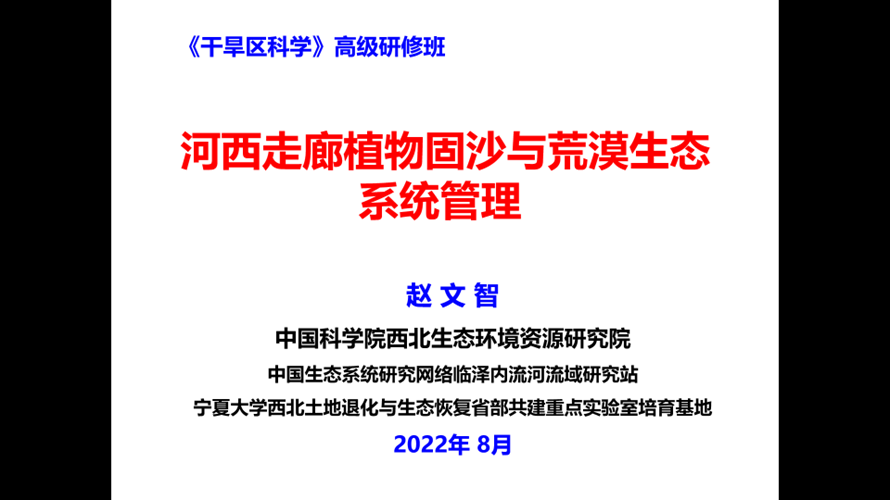 2022年8月2日,我院特聘教授、重点实验室学术主任赵文智研究员应荒漠与绿洲生态国家重点实验室《干旱区科学》高级研修班的邀请,以线上腾讯会议的形式,面向全国科研人员、硕、博士研究生,以及大专院校相关专业的师生,开展了河西走廊植物固沙与荒漠生态系统管理的主题讲座。讲座由荒漠与绿洲生态国家重点实验室主任陈亚宁研究员主持。