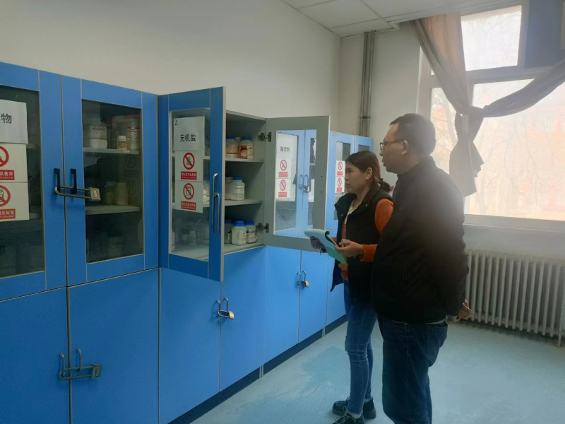 检查过程中,实验室工作人员仔细翻阅实验室登记本、检查灭火器的使用日期,向学生询问实验室日常管理规范,检查实验室卫生及实验物品是否摆放整齐。针对检查发现的问题和隐患,及时提出整改意见,并要求各实验室全面自查、分析原因、采取有效措施消除安全隐患。