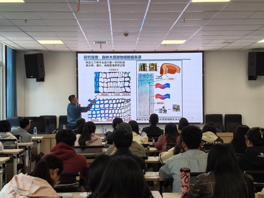 黄建国立足全球气候变化背景并分享了其团队近年来的科研成果。以森林生态学研究为切入点,系统阐释了团队如何通过树轮分析、树木解剖及统计建模等跨学科方法,揭示森林生长与气候变化的内在关联规律。报告核心围绕三大方向展开,树木径向生长对气候的动态响应、树高生长的气候适应特征,以及两类生长机制的协同作用研究,为认知森林生态系统适应气候变化的时空规律提供了突破性视角。报告会后,黄教授与我院师生就树木生长模型构建、气候变化对寒带-亚热带森林影响的差异性等问题进行了热烈的讨论和交流。