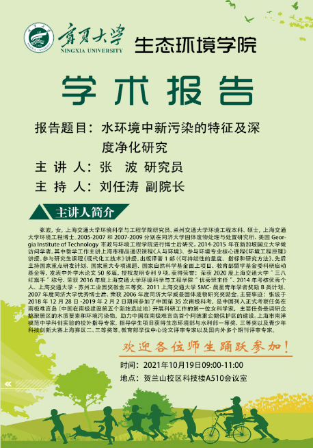 主讲人简介:张波,女,上海交通大学环境科学与工程学院研究员。兰州交通大学环境工程本科、硕士,上海交通大学环境工程博士。2005-2007和2007-2009分别在同济大学固体废物处理与处置研究所、美国Georgia Institute of Technology市政与环境工程学院进行博士后研究。2014-2015年在新加坡国立大学做访问学者。其中教学工作主讲上海市精品通识课程《人与环境》、参与环境专业核心课程《环境工程原理》讲授。参与研究生课程《现代化工技术》讲授。出版译著1部(《可持续性的量度、指标和研究方法》。先后主持国家重点研发计划、国家重大专项课题、国家自然科学基金面上项目、教育部留学基金委科研启动基金等,发表中外学术论文50多篇,授权发明专利9项。获得荣誉:荣获2020度上海交通大学“三八红旗手”称号、荣获2016年度上海交通大学环境科学与工程学院“优秀班主任”、2014年考核优秀个人、上海交通大学-苏州工业园奖教金三等奖、2011上海交通大学SMC-晨星青年学者奖励B类计划、2007年度同济大学优秀博士后、荣获2006年度同济大学威曼固体废物研究奖励金。主要事迹:张波于2018年12月28日-2019年2月2日期间参加了中国第35次南极科考,是中国列入正式考察任务在南极难言岛(中国在南极建设第五个新站选址地)开展科研工作的第一位女科学家,主要任务是调研企鹅聚居区的水质要素和环境污染物,助力中国在南极难言岛首个阿德雷企鹅保护区的建设。上海市南洋模范中学科创实验的校外指导专家,指导学生项目获得生态环境部与水利部一等奖、三等奖以及青少年科技创新大赛上海赛区二、三等奖等。教育部学位中心论文评审专家以及国内外多个期刊评审专家。