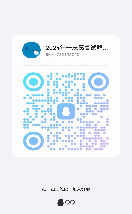 本通知发布后至复试结束,考生须保持手机通讯畅通,学院将打电话通知各项事宜,同意参加复试的考生须在规定时间内按照通知要求参加复试,逾期未确认者视为自动放弃本次复试资格。扫描二维码,加入2024年一志愿复试QQ群。
