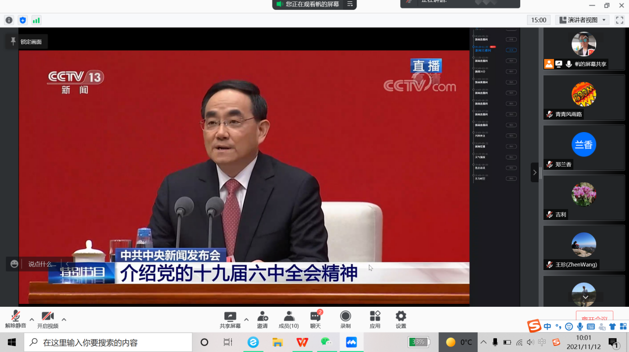 11月12日上午,环境科学与工程系教工党支部组织全体党员以视频方式集中观看党的十九届六中全会新闻发布会,学习十九届六中全会精神。会议由支部书记杨帆主持,全体党员参加了专题学习活动。