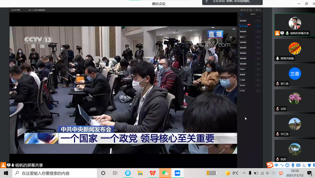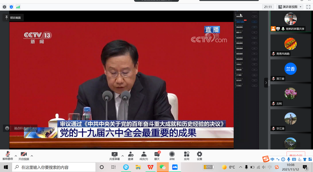 杨帆书记带领与会党员简单了解了《中国共产党第十九届中央委员会第六次全体会议公报》的主要内容,之后与会党员一同观看了新闻发布会直播。