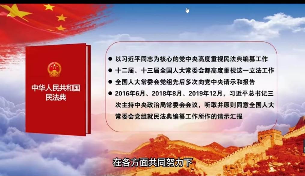 本次活动由支部组织委员王益涛主持,同时由党小组成员何文强、侯汶君领学。两位领学人分别就《民法典》的出台背景、立法重要性、基本内容等方面进行了介绍,并结合视频资料中的具体案例,介绍了《民法典》中大数据时代的隐私权及个人信息保护、民间借贷、乘客不按票就坐和高空抛物侵权责任等亮点内容。