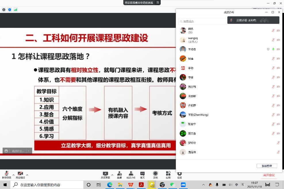 他山之石,可以攻玉。王幼奇老师先分享了其他高校关于工科类课程如何开展课程思政的总结汇报PPT,使大家认识到应当在课程中落实立德树人,深入挖掘各类课程和教学方式中蕴含的思政教育元素,完善课程思政教学体系和内容体系。