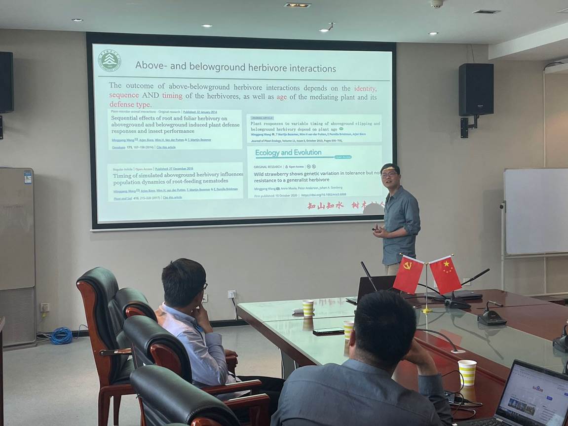 王明刚研究员以“Combining above - belowground linkages with plant-soil feedbacks”为题,从国际前沿领域围绕植物与土壤互为反馈的地下和地上相互影响方面进行介绍,重点结合自己在荷兰瓦赫宁根大学长期的研究工作介绍了取得的最新研究进展。徐红伟副教授以“植物-土壤反馈作用对撂荒演替的驱动机制”为题,重点从黄土高原撂荒演替的三个阶段植物物种更替与土壤的相关作用关系,介绍了取得的最新研究成果。