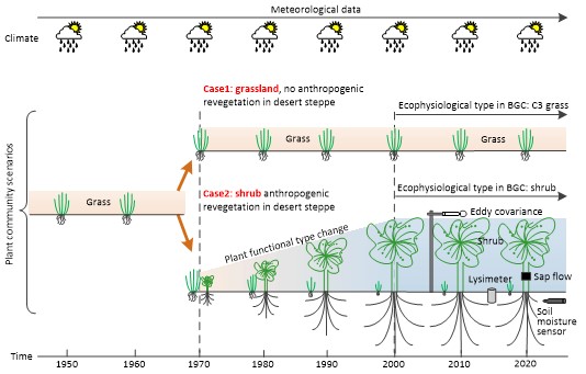 我院杜灵通研究员与荷兰特文特大学ITC水资源系合作,带领团队围绕这一科学问题、以宁夏盐池县荒漠草原种植的人工灌木林为研究对象,采用模型模拟和涡度相关通量观测的方法(图2),揭示了人工灌丛入侵荒漠草原的碳水循环响应机理(图3)。研究得出,荒漠草原人工种植灌木显著地增强了陆地生态系统的碳循环,增加了生态系统的碳储量,使生态系统由弱碳源向强碳汇转变。同时,增强了生态系统的蒸散耗水量,降低了土壤贮水,这将对生态系统的稳定性产生影响。因此,在双碳背景下,在荒漠草原区种植灌木有利于碳中和目标实现,但一定要考虑其生态水文阈值。该成果近期以“Effects of anthropogenic revegetation on the water and carbon cycles of a desert steppe ecosystem”为题发表在农林类一区TOP期刊《Agricultural and Forest Meteorology》上。