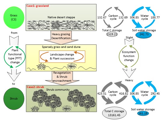 图2 基于荒漠草原和人工灌木入侵两种不同情境的生态系统碳水循环模拟 |