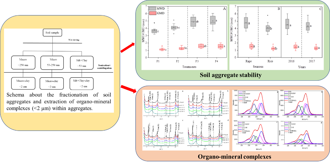 前期,本团队薛斌博士为了研究秸秆还田后土壤团聚体的形成和稳定机制,将团聚体中的有机-矿物进行分离,利用X射线多晶衍射仪和X射线光电子能谱分析其中的矿物和有机组分。研究发现秸秆还田处理增加了团聚体中粘粒表面的有机组分(C=C和O-C=O)和矿物组分(非晶形铁矿物和蛭石)的含量,促进了有机-矿物复合体的形成,进一步改善了团聚体的结构和稳定性。研究结果以Feature Papers(专题论文,代表了在该领域具有重大影响潜力和最先进的研究)的形式发表在Agronomy国际期刊上(IF=3.417,中科院三区)。
