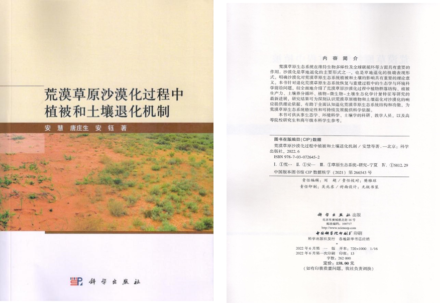 日前,荒漠生态与全球变化科研团队在荒漠草原沙漠化过程中植被和土壤退化方面取得了进展。研究结果于2022年6月在科学出版社出版。专著中针对退化荒漠草原生态恢复与重建过程中的生态学与环境科学前沿问题,较全面地介绍了荒漠草原沙漠化过程中植物群落结构、植被生产力、土壤养分循环、植物-微生物-土壤生态化学计量特征等研究的最新进展,研究结果可为深刻认识荒漠草原植物和土壤退化对沙漠化的响应提供理论依据,有助于全面认知退化荒漠草原生态系统结构和功能,为荒漠草原生态系统稳定性和可持续发展提供科学依据。