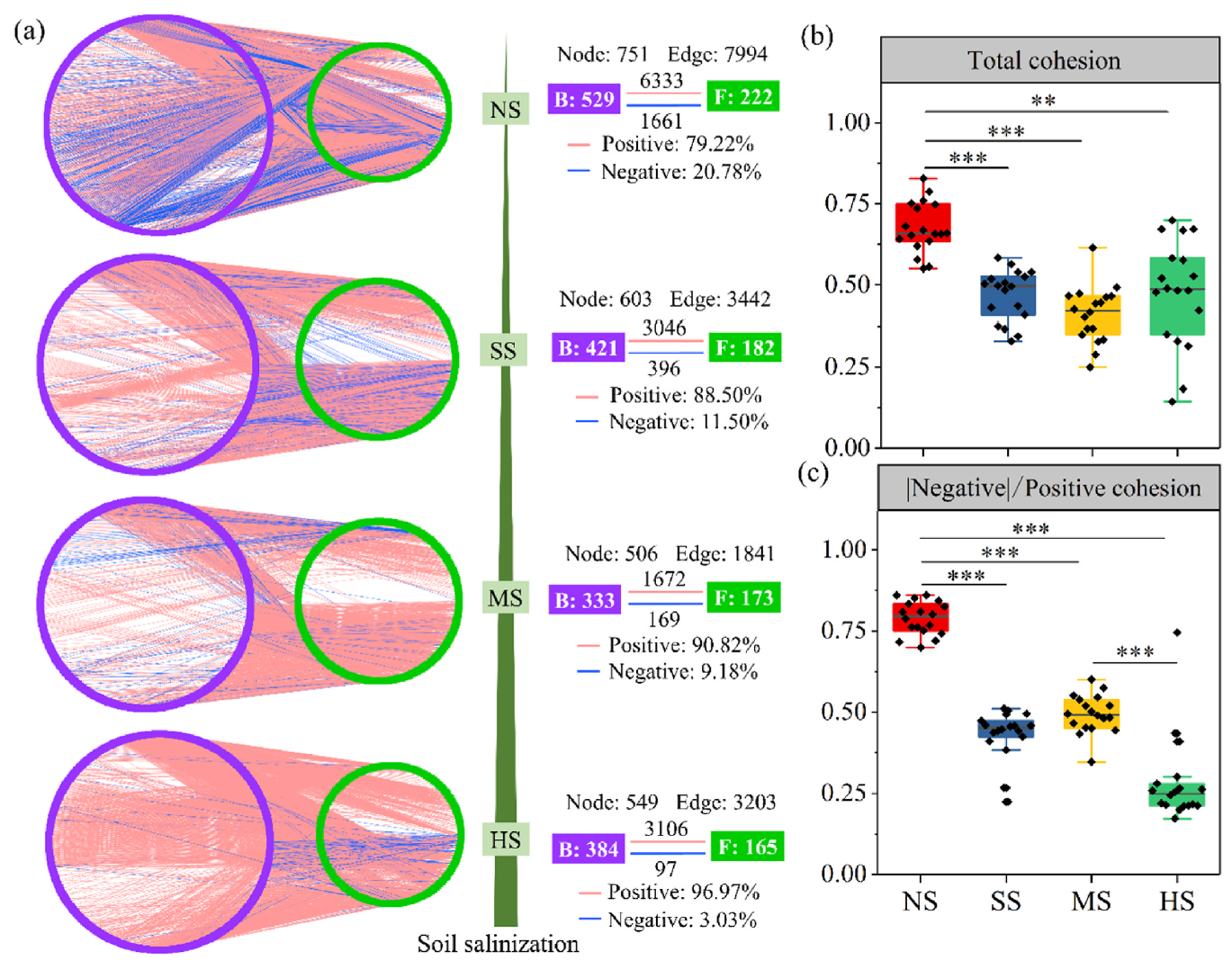图2.不同盐渍化程度土壤中的细菌-真菌界网络(a),微生物共生网络的总内聚力(b)和负内聚力与正内聚力之比(c)