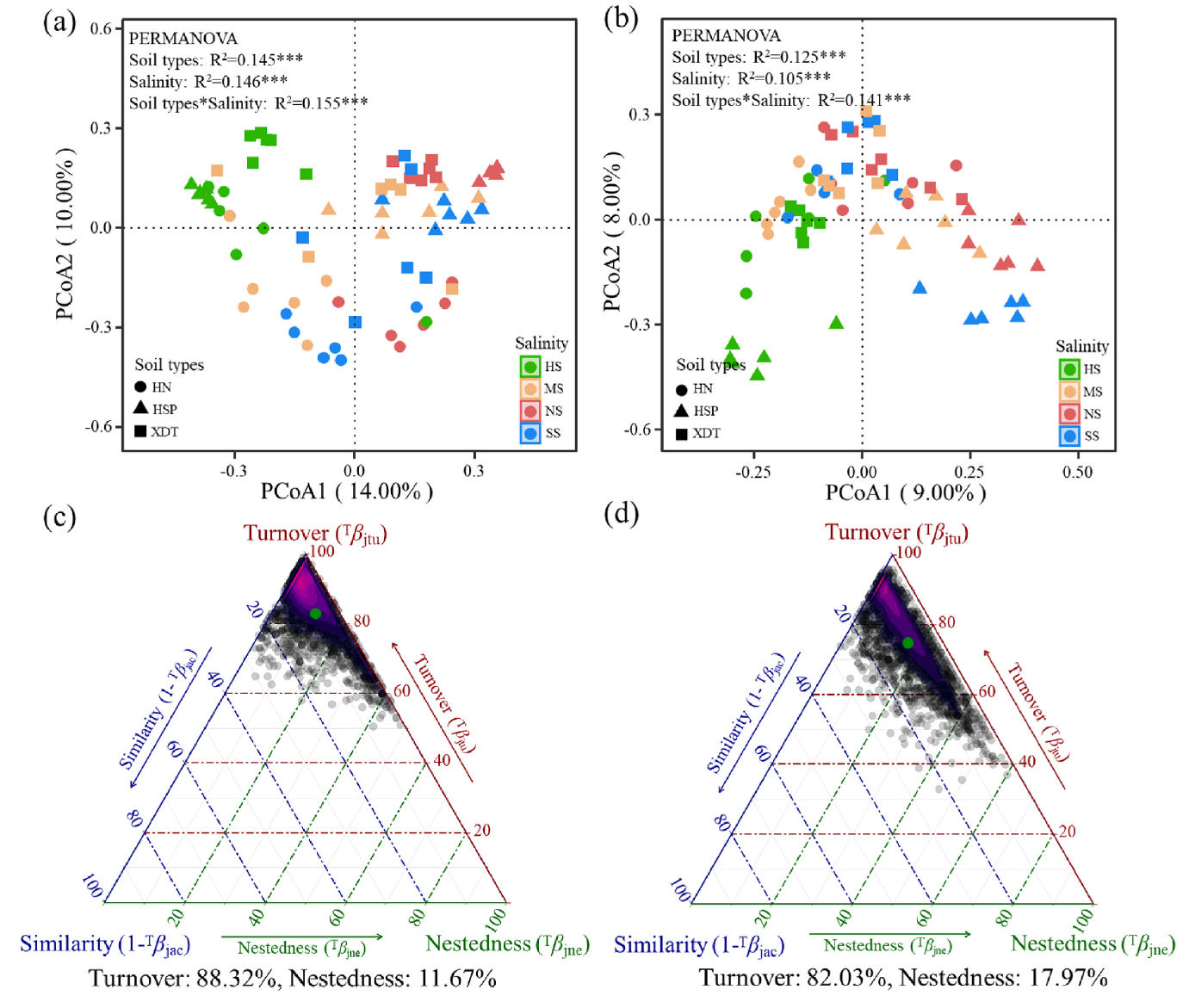 图1.细菌(a)和真菌(b)的PCoA分析。三角图描绘了所有地区和盐度水平的细菌(c)和真菌(d)的β多样性