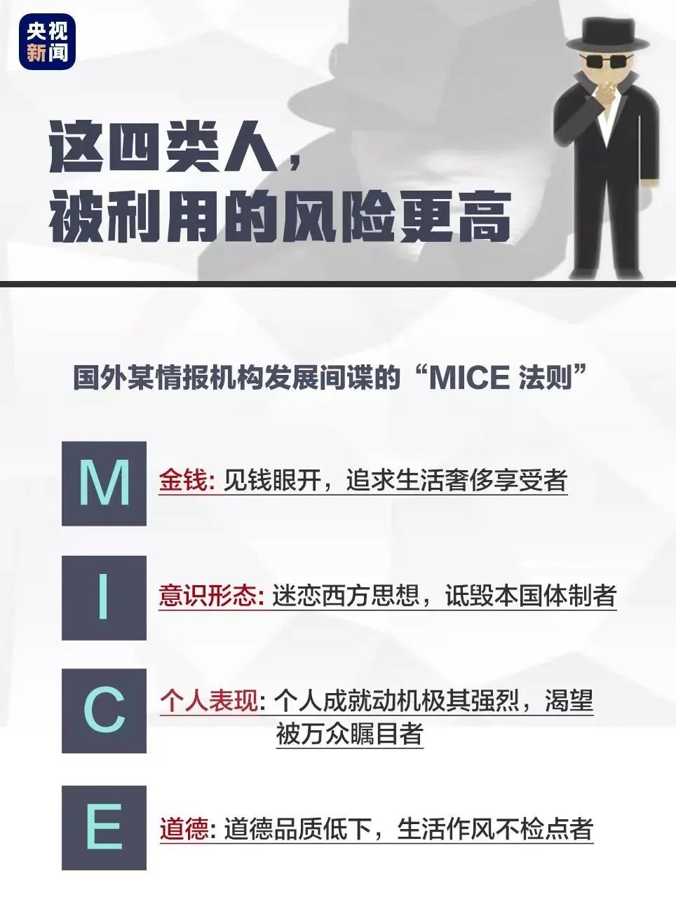 据国家安全机关统计,留学生、高校师生、军事发烧友、军工企业国防科研单位人员、年轻网友等容易被境外间谍机构策反,可能会被利用。