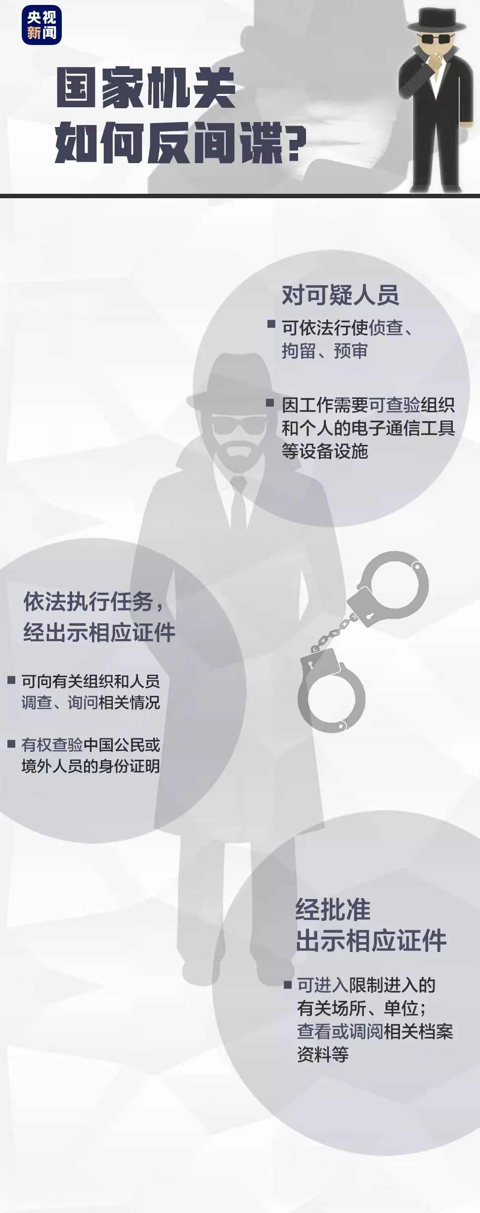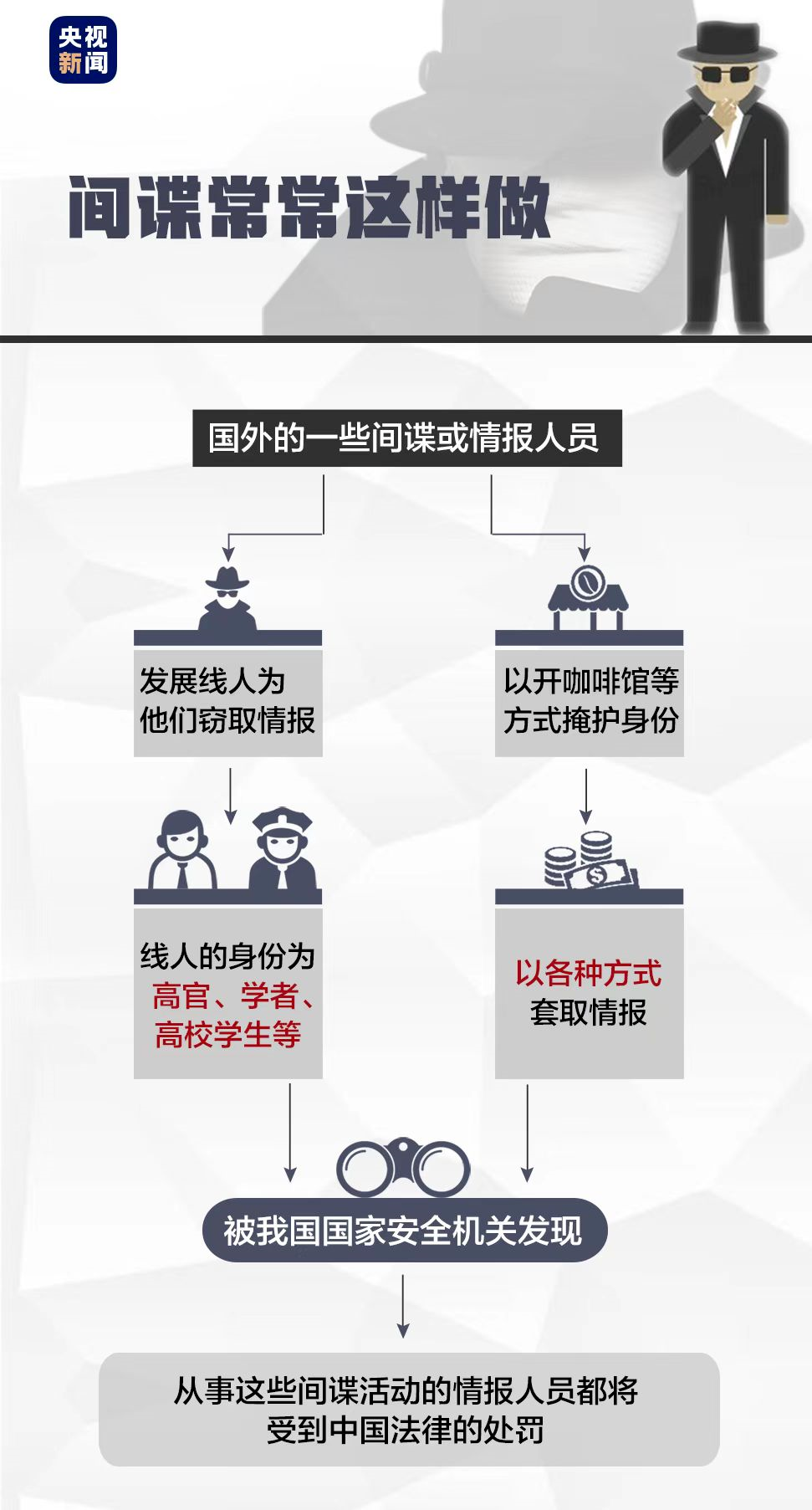 以上种种行为,一经我国国家安全机关发现,从事这些间谍活动的情报人员都将受到中国法律的处罚!